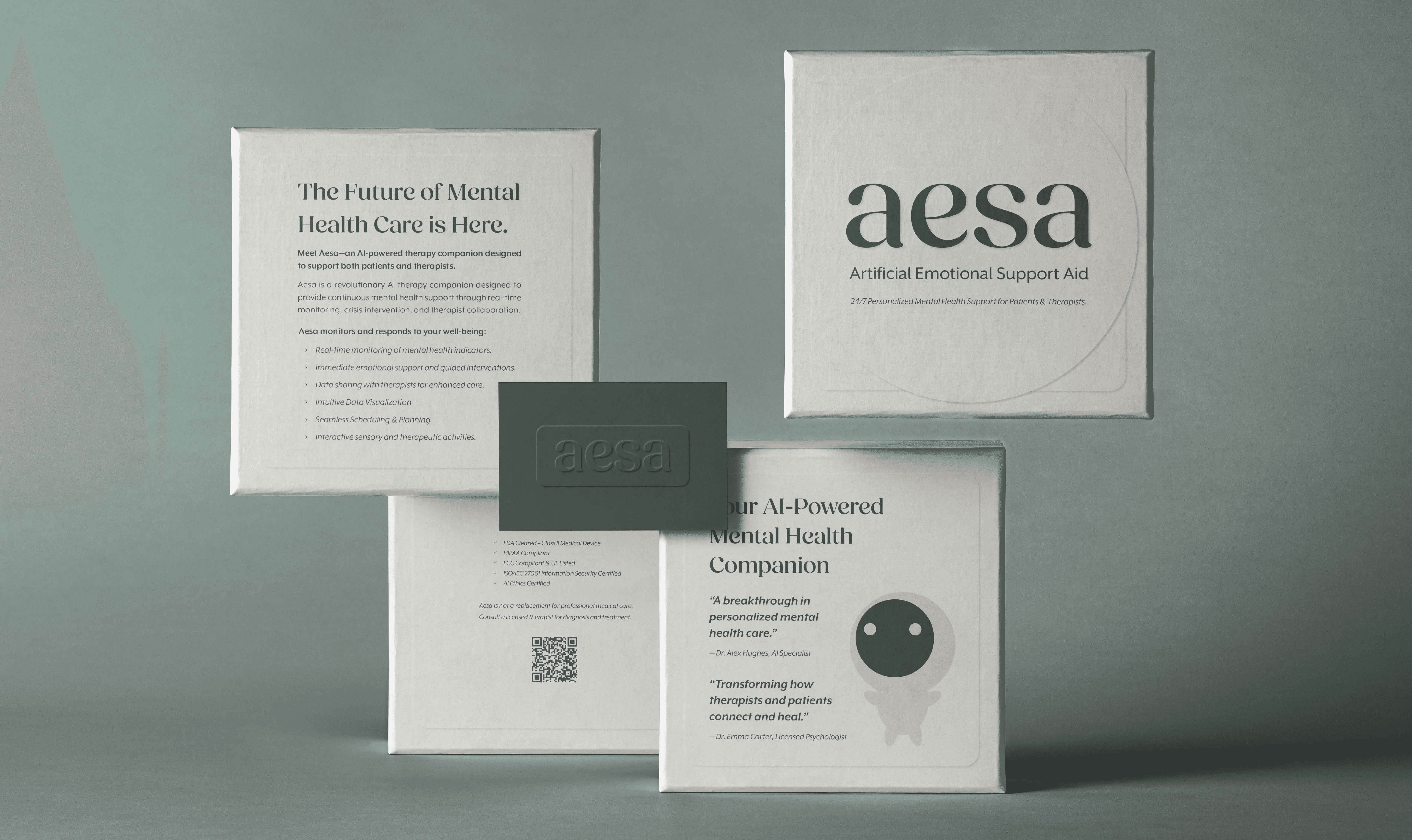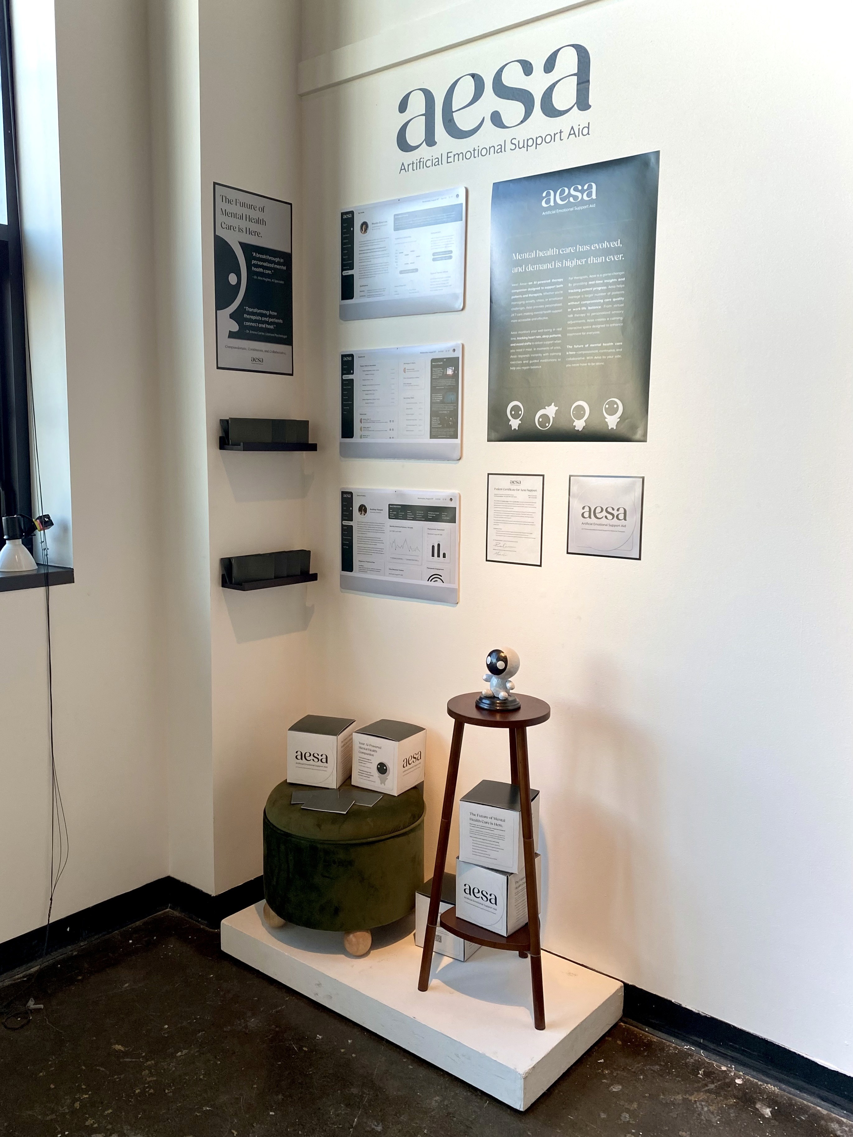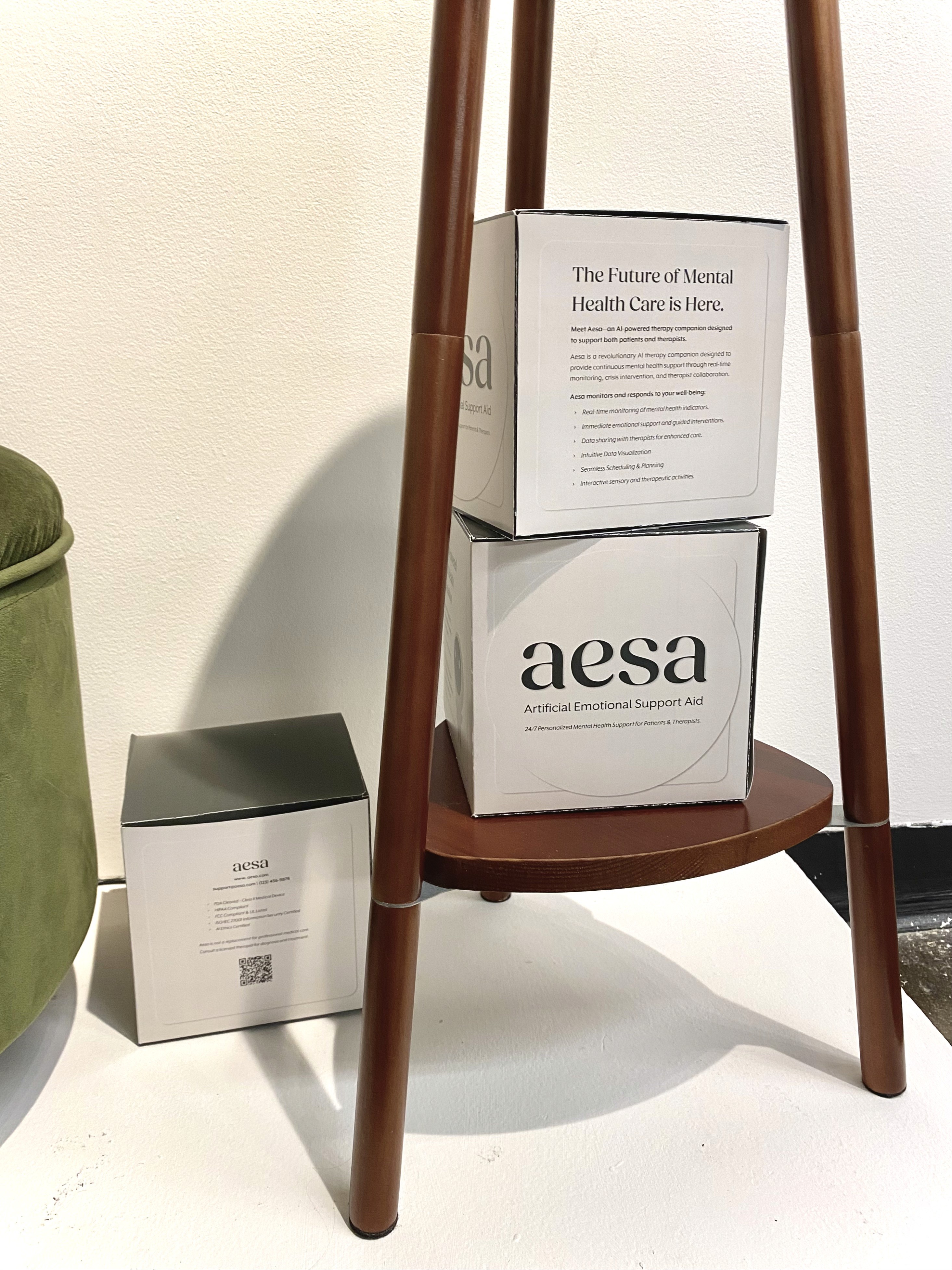 Aesa — short for Artificial Emotional Support Aid — is a speculative design project that depicts a future where AI-powered therapy is seamlessly integrated into daily life. I designed Aesa’s visual identity, packaging, and webpages to explore how technology could provide adaptive emotional support while maintaining a sense of warmth and humanity.