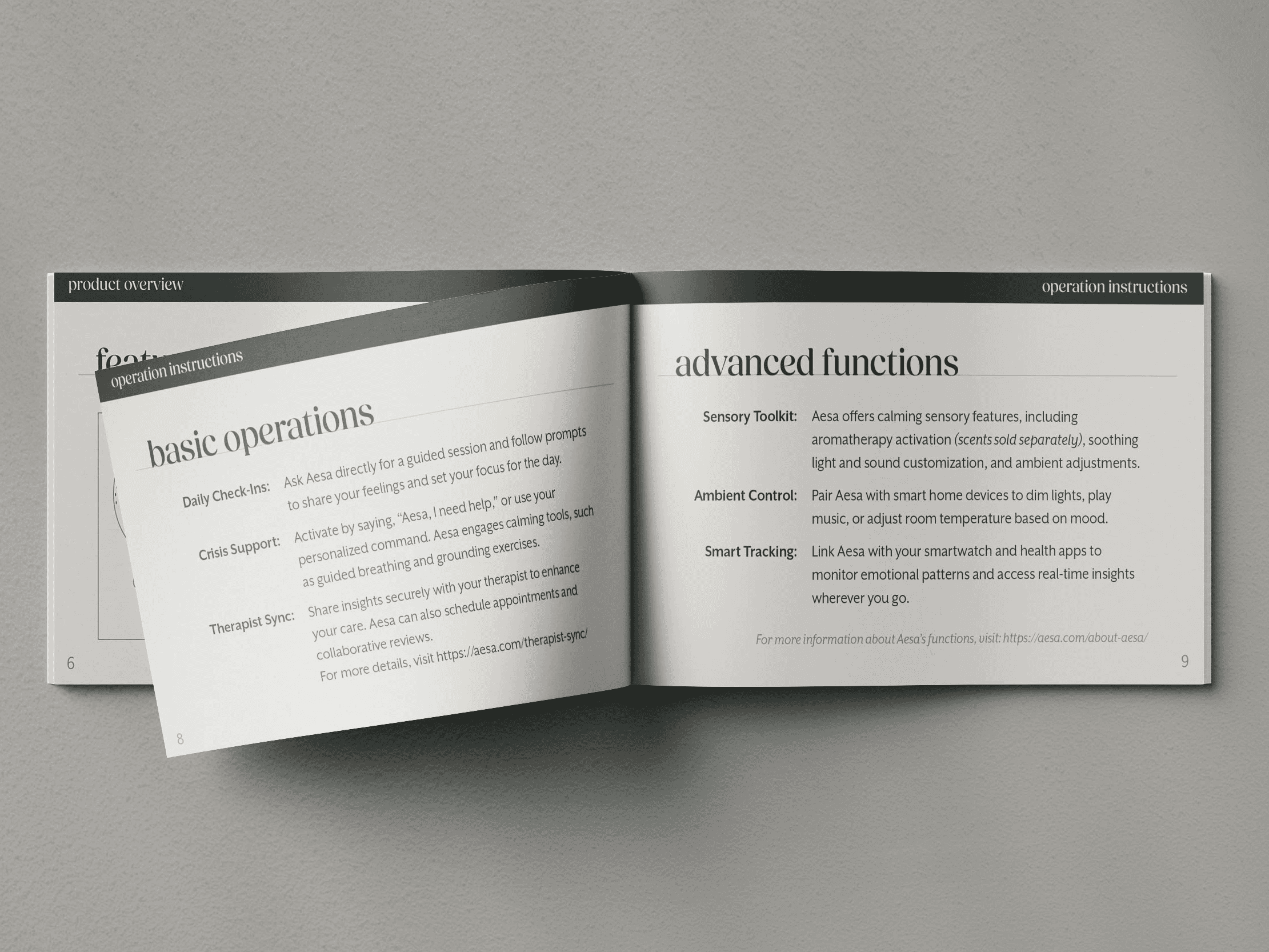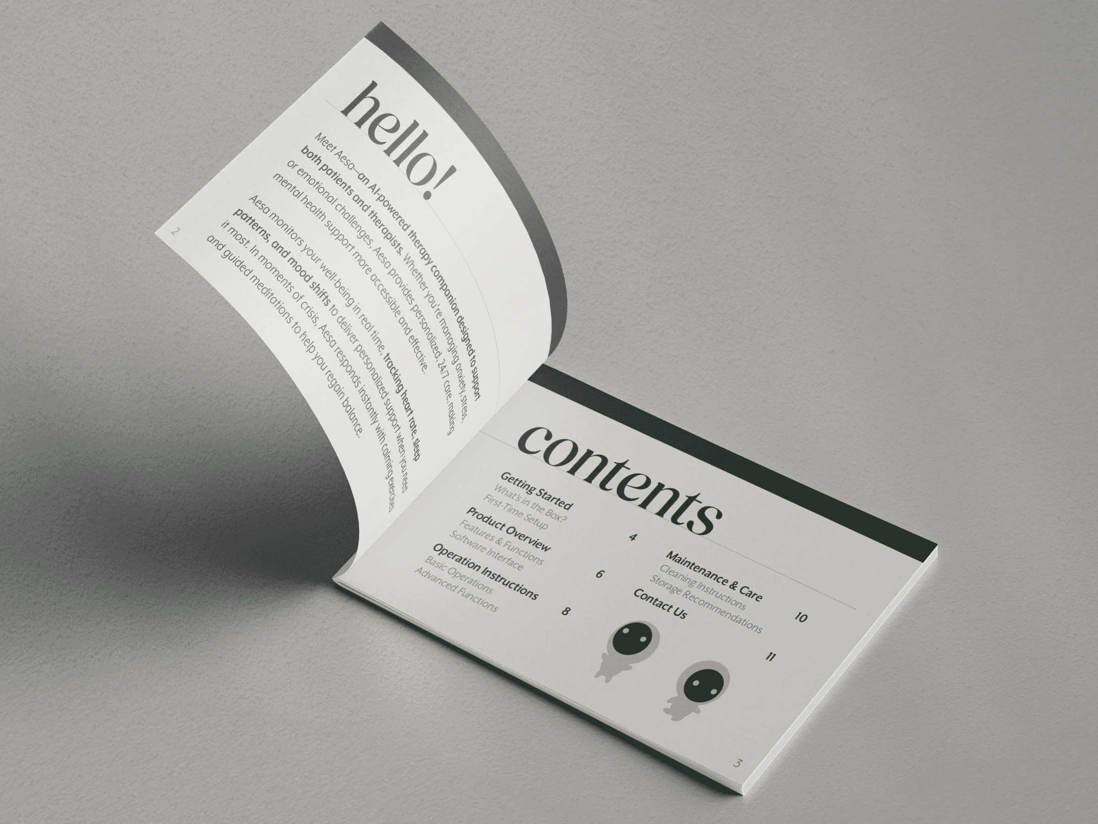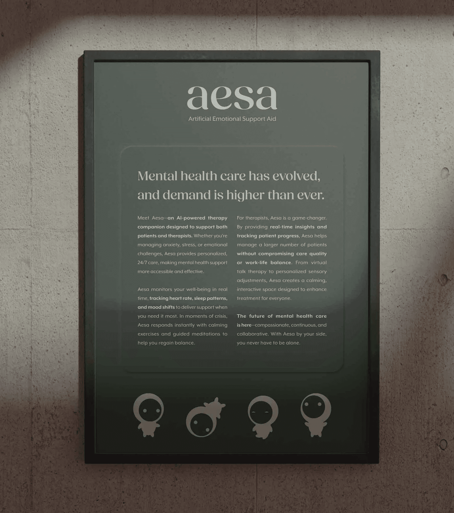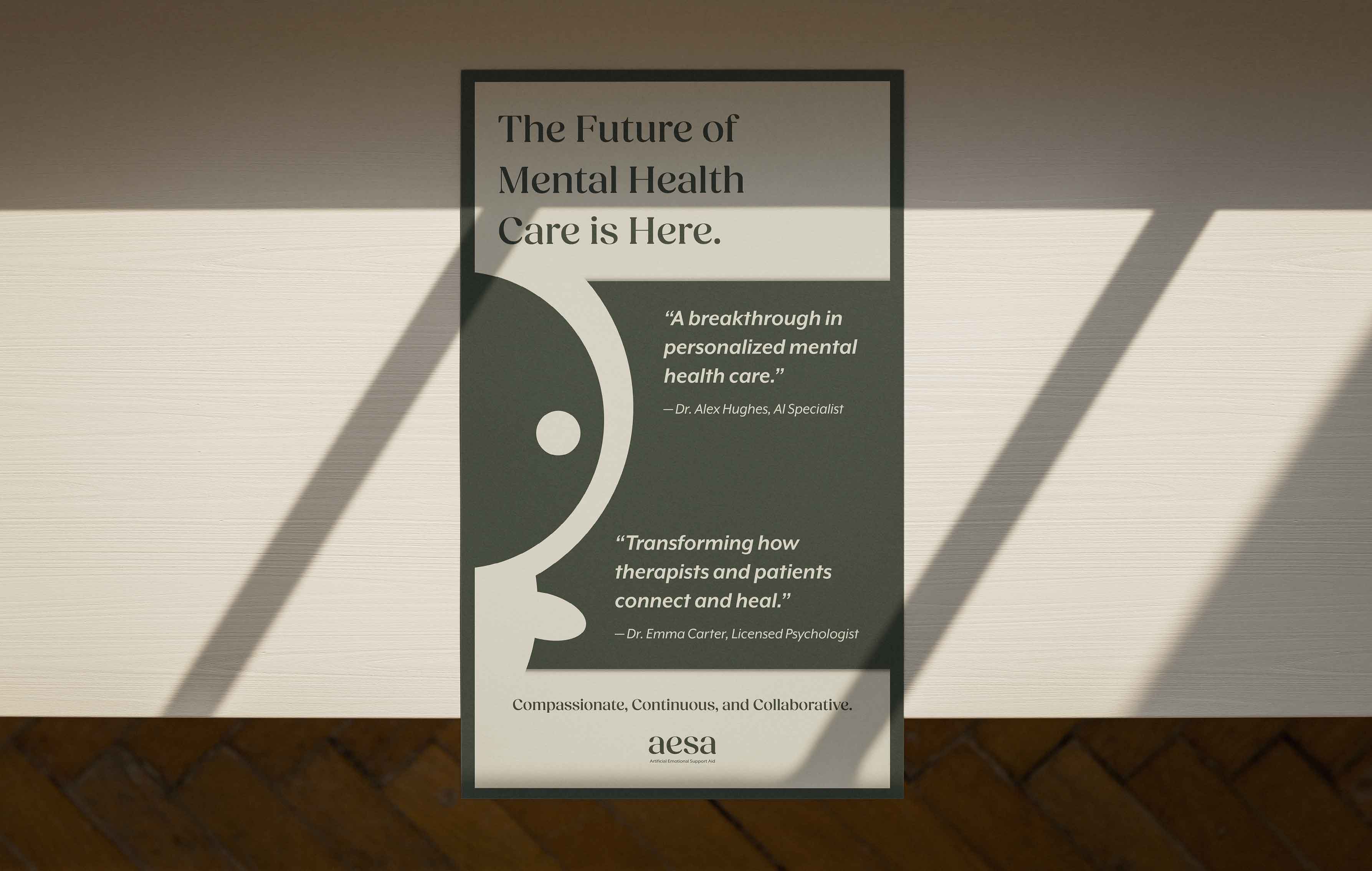 Aesa — short for Artificial Emotional Support Aid — is a speculative design project that depicts a future where AI-powered therapy is seamlessly integrated into daily life. I designed Aesa’s visual identity, packaging, and webpages to explore how technology could provide adaptive emotional support while maintaining a sense of warmth and humanity.